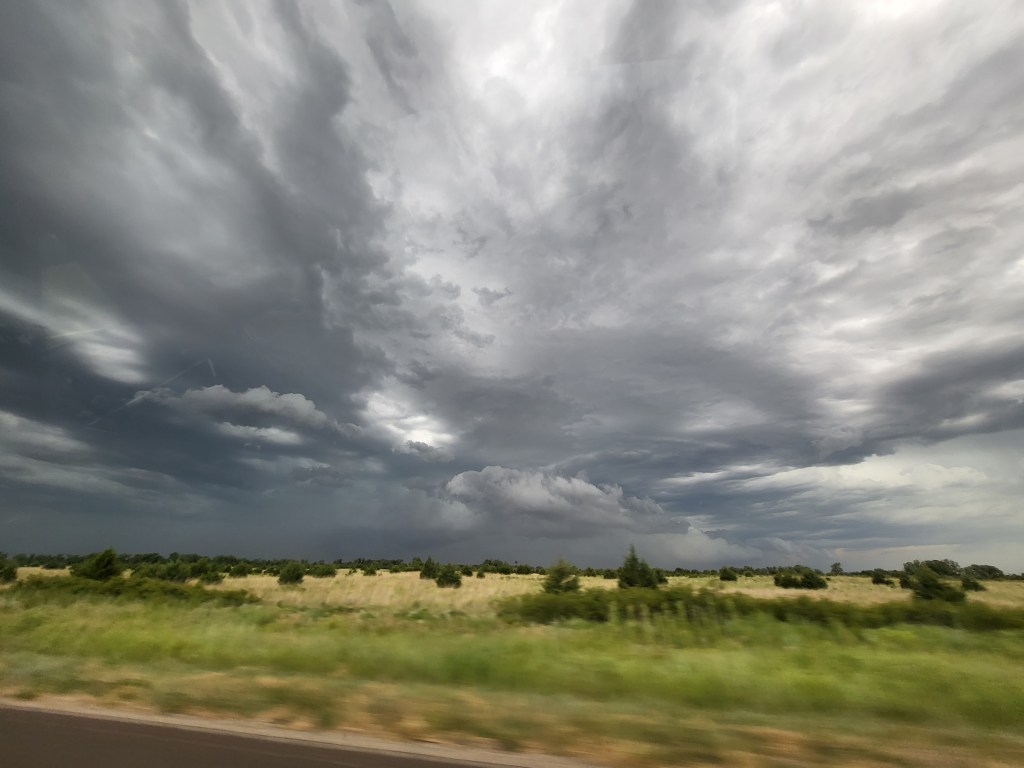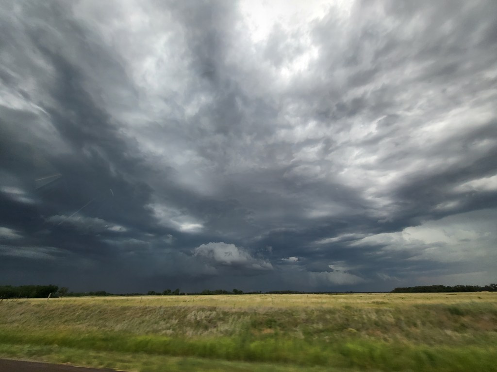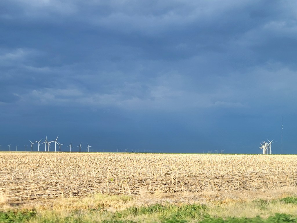 I tried not to worry as the sky darkened around us. The weather apps warned of thunderstorms in the vicinity, and the flatness gave a generous view of a storm to the north, but when you are seeing in two dimensions it’s hard to tell how far away lighting is when it slashes the horizon. The lighting, while fierce, could have also been entertaining, but it was not visible from Julian’s side of the car.